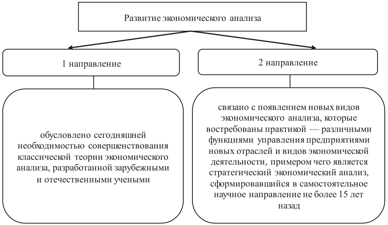 Профессор Н. С. Пласкова [6, С. 36–38] отмечает, что экономический анализ как важнейшая отрасль экономической науки и как область практической деятельности развивается по двум основным направлениям (рисунок 1).