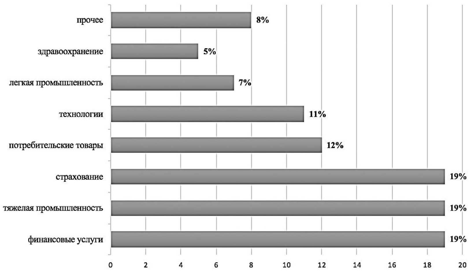 В России отраслевые исследования гигономики начали активно проводится с 2020 г. По данным отчета PWC «Gig-экономика, февраль 2021 г.» наибольший спрос на труд гиг-работников в России был сосредоточен в сфере страхования (19%), тяжелой промышленности (19%) и финансовых услугах (18%). Менее популярными сферами стали легкая промышленность (7%) и здравоохранение (5%) (см. рисунок 3)9.