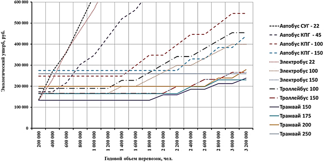 Рисунок 1. Зависимости экологического ущерба при эксплуатации транспортных средств городского наземного пассажирского транспортного комплекса от годового объёма перевозок