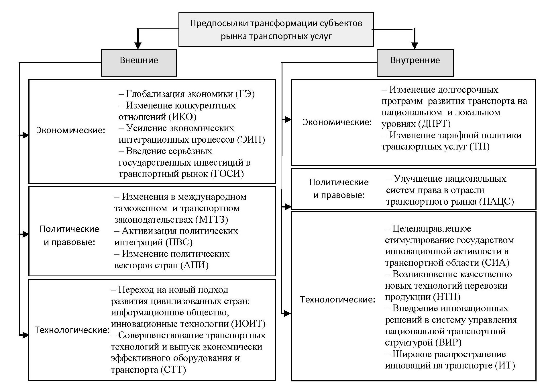 К внешним предпосылкам, во-первых, относится глобализация экономики, которая приводит к увеличению потоков и объемов товаров, услуг, технологий и капиталов, а также к ускорению их движения через государственные границы. Во-вторых, изменение конкурентных отношений, преимущественно связанных с общей автоматизацией логистики, обеспечивает всё большую прозрачность процессов и параллельно снижает рентабельность сделок. Если в настоящее время жёсткий демпинг рынка транспортных услуг можно наблюдать периодами, то в скором времени он будет происходить на постоянной основе. Таким образом, если компании – субъекты рынка транспортных услуг – хотят остаться конкурентоспособными, им уже сейчас следует планировать внедрение в свою деятельность интеллектуальных технологий, хотя бы для сохранения текущего уровня прибыли. Третьей внешней предпосылкой является усиление экономических интеграционных процессов. В результате это приводит субъекты рынка транспортных услуг к необходимости рассмотрения вопросов внедрения современных технологий в свою деятельность, выстраивания новых безупречных логистических систем, которые бы способствовали снижению издержек на себестоимость перевозки в целом [12]. Кроме того, выделяют еще две основные внешние политические предпосылки трансформации субъектов рынка транспортных услуг, к которым относятся изменения в международном таможенном и транспортном законодательствах и активизация политических интеграций [16].
