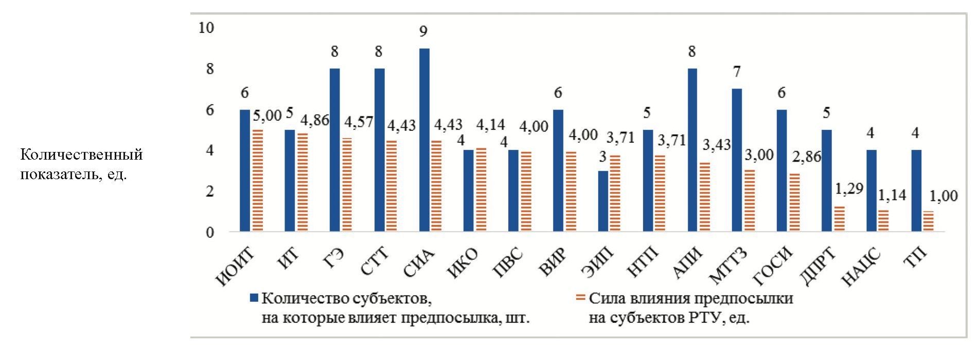 Из рисунка 4 видно, что предпосылка может влиять на большое количество субъектов, но с незначительной силой и почти не отражаться на их трансформации. В топ-10 предпосылок по силе влияния вошли, в основном, технологические предпосылки, три из которых занимают первые места по силе влияния. Все они отражают создание и развитие новых инновационных технологий и степень их распространения на транспорте. Группа политических и внутренних экономических предпосылок завершает топ наименьших по степени влияния предпосылок, что говорит только о создании условий для трансформации субъектов, которая не активизируется без технического прогресса и возможностей внешнеэкономических связей.