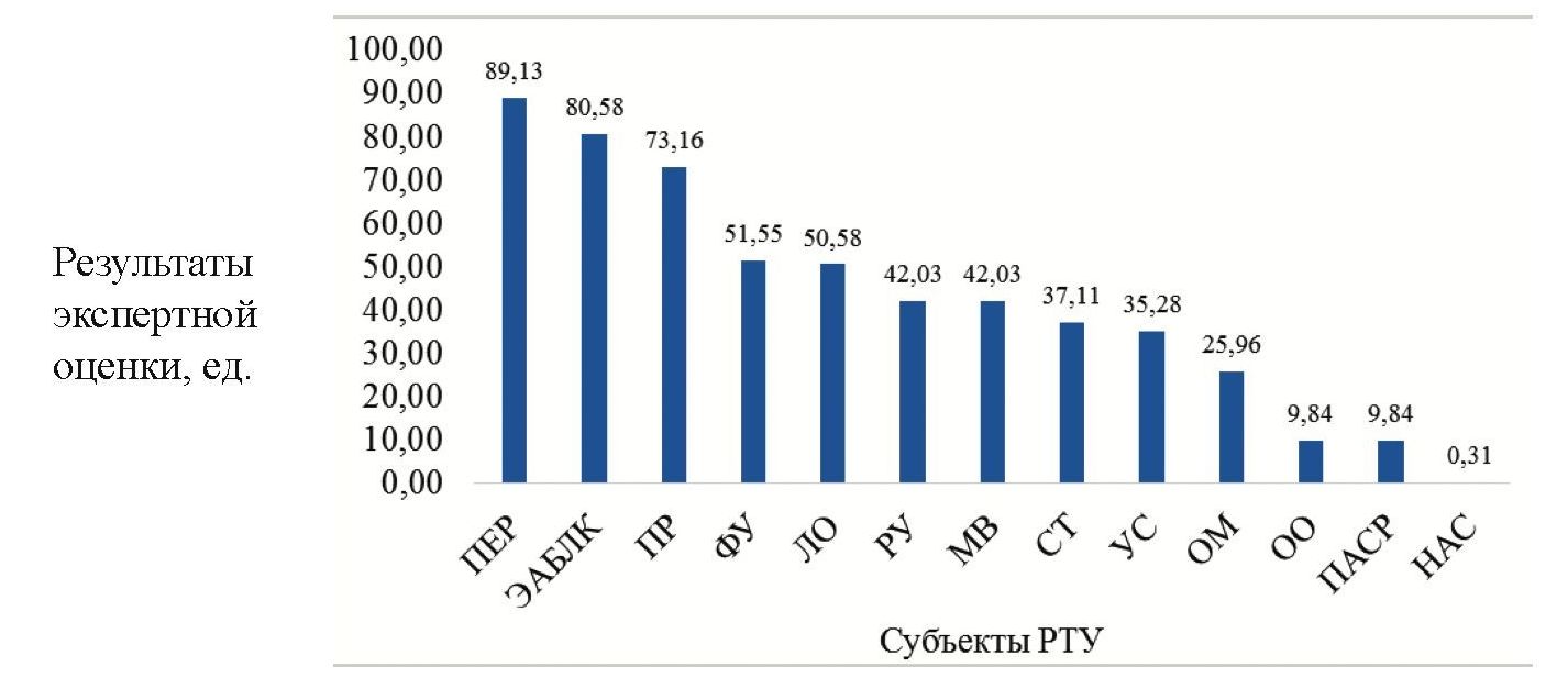 На рисунке 3 представлены результаты расчёта итогового влияния предпосылок на инновационную трансформацию субъектов, ранжированные в порядке убывания итогового значения влияния.