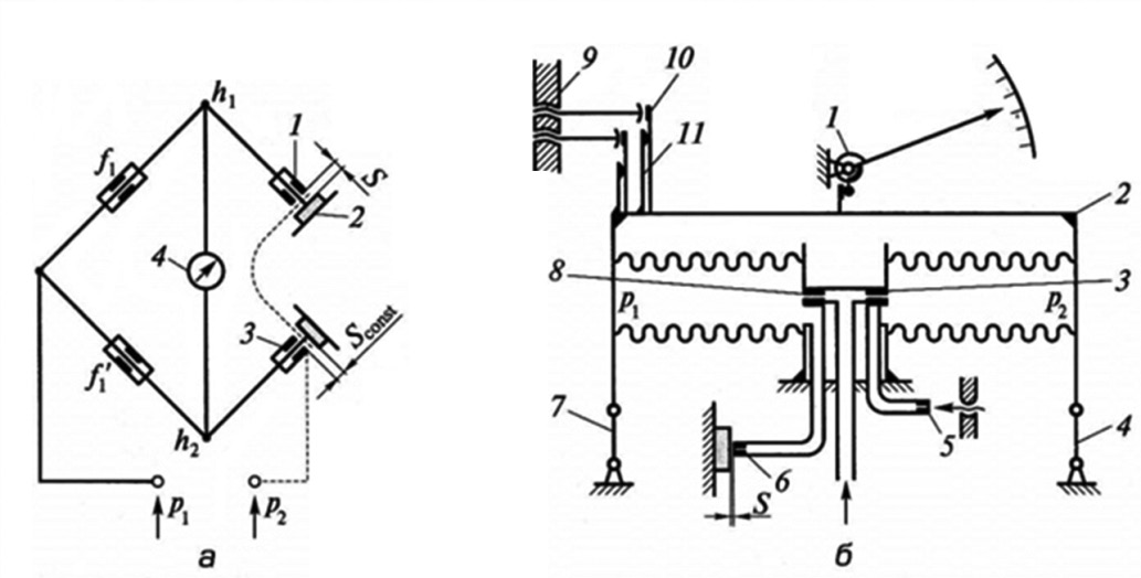 Рисунок 2. Дифференциальный пневматический прибор: а) измерительная схема; б) схема дифференциального сильфонного прибора