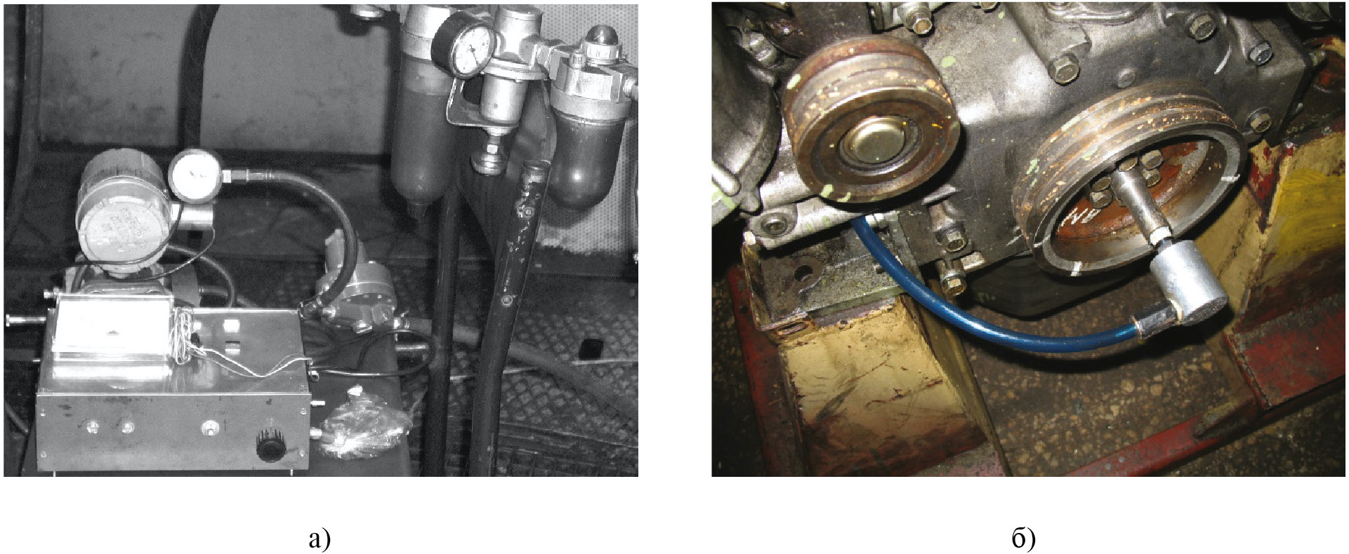 Коленчатый вал двигателя доработан по передней шейке 5-го цилиндра для подвода измерительного воздуха по оси коленчатого вала с выходом через два жиклера, расположенных диаметрально противоположно в плоскости 30о от оси кривошипа после ВМТ 5-го цилиндра по центру шейки [7]. В разработанном устройстве применялся преобразователь давления «Сапфир-22Д» и измерительное устройство типа «Marposs».