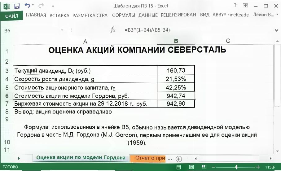 - вычисление стоимости акций фирмы на основе их будущих ожидаемых дивидендов в соответствии с моделью Гордона;