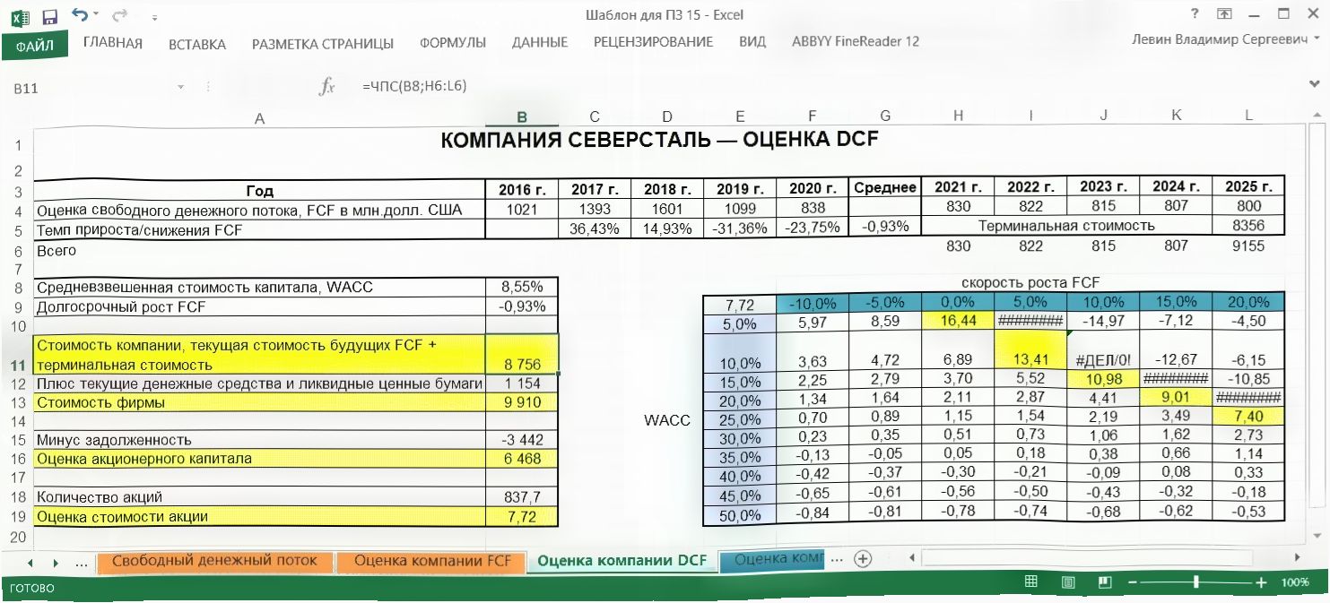 Найти рассчитанное значение справедливой стоимости акции (Fair Value) можно на специализированных сайтах, например, Finbox. Рассчитанное значение DCF на акцию ПАО «Северсталь» на данном сайте составляет 2 348 руб. При существующей на момент оценки рыночной цене в 1 597 руб. акция недооценена рынком, а потенциал роста (Upside) составляет 41,1%. При этом в расчете использовалась ставка дисконтирования r = 9,5%, а ставка долгосрочного роста свободных денежных потоков g = 18,9%. Это гораздо более оптимистические критерии, заложенные в оценку по данной модели. Другое готовое решение модели DCF для ПАО «Северсталь» выполнено А. Дамодараном, который использовал ставку дисконтирования 9,32%. Ставка долгосрочного снижения свободных денежных потоков FCF составила –0,83%. Эти оценки более приближены к нашим модельным расчетам, но используют более длительный десятилетний период прогнозирования, а справедливая стоимость акций составляет 14,88 долл. США на акцию, или 1096,5 руб. по текущему на тот момент валютному курсу. Это подтверждает наш вывод о переоценке рынком акций компании ПАО «Северсталь».