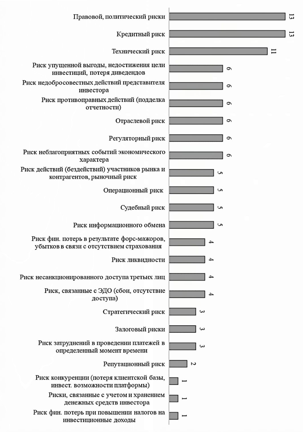Возможные риски для инвесторов и заемщиков связаны с вероятностью потери дохода инвестора в случае неэффективности проекта, снижения временной стоимости денег под влиянием инфляции, низкой ликвидности акций, неустойчивости экономики, неплатежеспособности заемщика или непривлекательности предпринимательской идеи [1; 3; 10]. Сдерживающий эффект оказывают комплаенс-риски, вызванные несоблюдением требований и правил работы платформы – убытки по причине мошенничества и обмана, организации финансовых пирамид и нелицензионных операций, невыполнения договорных обязательств, отсутствия контроля за целевым использованием средств, потерей прав на цифровой актив, нарушением прав акционеров, неблагонадежностью участников платформы и изменением законодательства [1; 2; 4; 9]. Куваева Ю. В. и соавторы [3], Г. Т. Папаскуа [5] обращают внимание на высокие риски недостоверности информации, размещаемой на цифровой инвестиционной платформе и низкого уровня информированности участников транзакций.