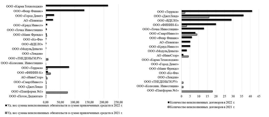 Примечание: в выборку включены инвестиционные платформы, у которых имеются неисполненные обязательства по договорам в 2021–2022 гг.
