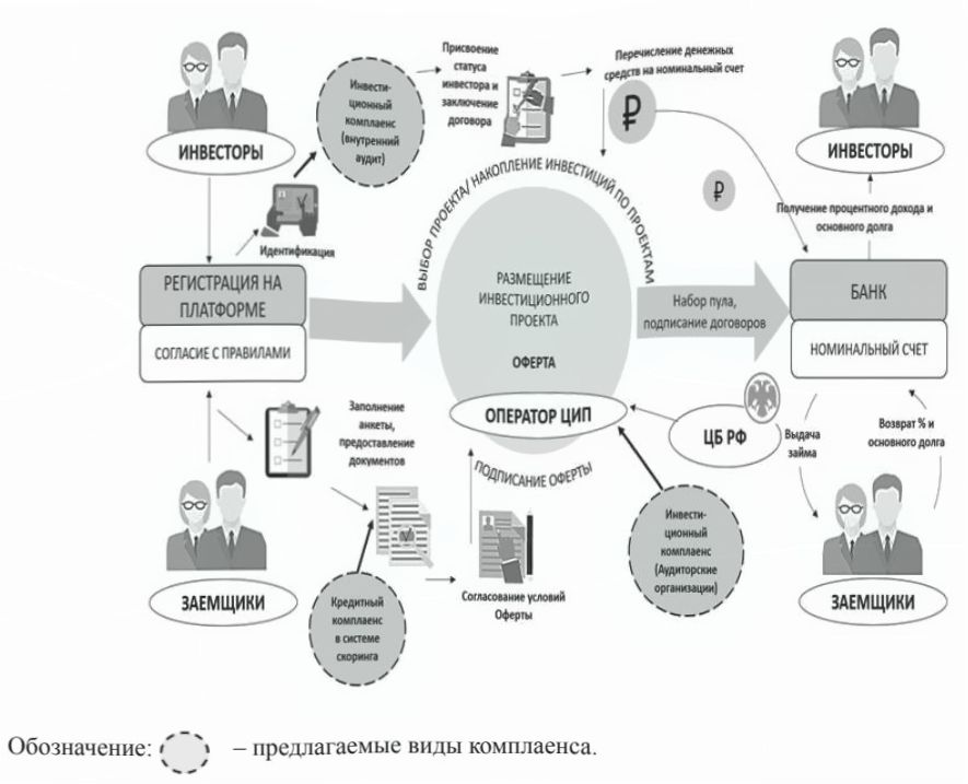План комплаенса содержит проверку достоверности бухгалтерской отчетности заемщика, на основе которой делается вывод о финансовом состоянии и способности реализовать предлагаемый проект, принятые проектные обязательства и достоверность оценки эффективности проекта [11]. Основными процедурами также выступает проверка правильности выбора допущений и методов прогнозирования инвестиционной доходности. В ходе комплаенса подтверждается достоверность договорных обязательств, проверяются все стадии их выполнения и подтверждается правильность оценки кредитных рисков. Методы комплаенса должны включать дополнительные процедуры проверки соблюдения законодательства в сфере противодействия отмыванию доходов, полученных преступным путем и финансирования терроризма (ПОД/ФТ), оценки средств контроля, применимых операторами в условиях обработки информации цифровыми системами. В ходе комплаенса проводится финансовая экспертиза условий договоров и мониторинг средств контроля, необходимых для исполнения договорных обязательств. Таким образом, внедрение системы комплаенса в цифровую инвестиционную экосистему обеспечит доверие к краудфандингу и снизит риски инвестиционных потерь для инвесторов и исключения оператора из реестра Банка России.