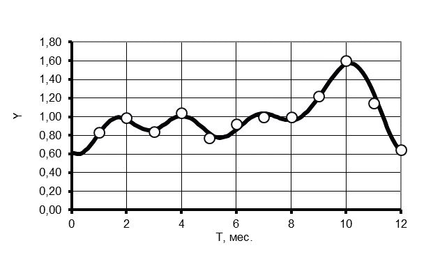 Влияние сезонных условий на параметр потока отказов считалось значимым, если он имел статистически значимую корреляционную связь с линеаризованной первой гармоникой (период – один год). Расчеты показали, что указанный коэффициент корреляции составляет 0,5778. Расчетное значение t-статистики Стьюдента для него превышает табличное значение с вероятностью более 0,95 (таблица 2).