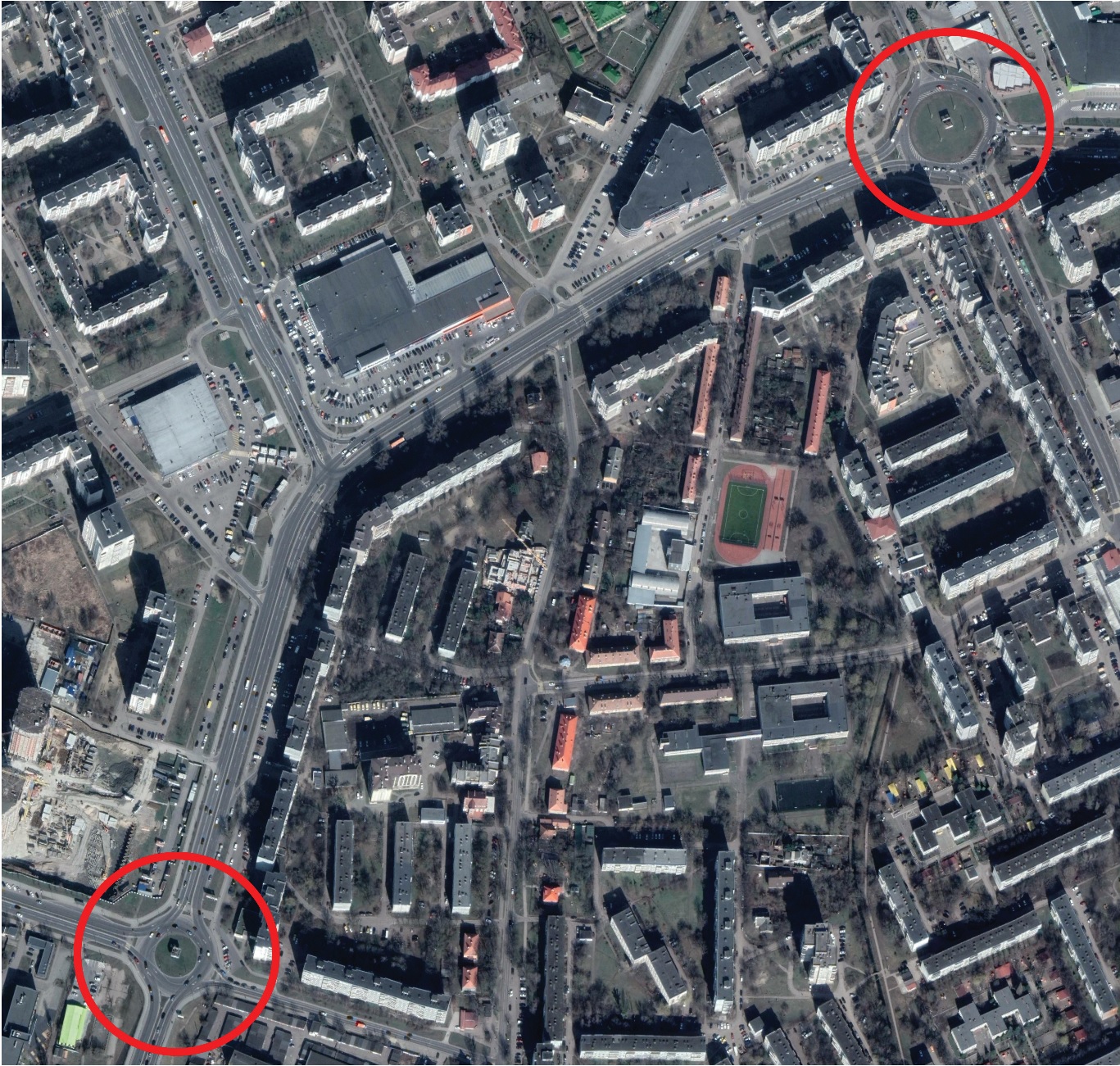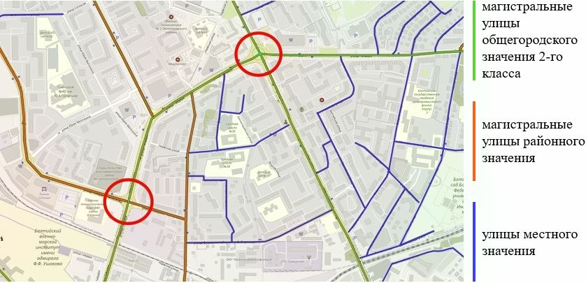 Исследуемые кольцевые пересечения являются важными узлами транспортной системы, так как связывают крупный жилой район с центральной частью города. В рабочие дни в утренние и вечерние «часы пик» можно регулярно наблюдать заторы на подходах к пересечениям, а также непосредственно на кольцевой проезжей части.