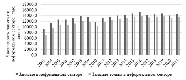 Рассмотрим динамику изменений численности занятых в неформальном секторе в России. Для этого обратимся к результатам обследований, проводимых Росстатом с начала 2000-х годов в области рабочей силы и занятости. На рисунке 1 представлены данные за 2001–2021 годы, за исключением 2002–2003.