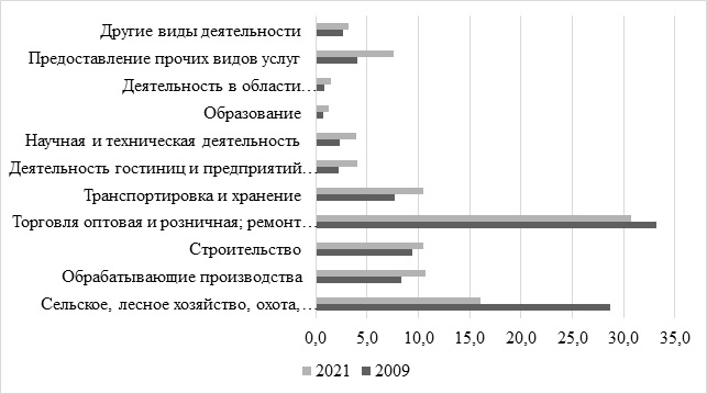Из графиков рисунка 2 видно, что по-прежнему сохраняется самый высокий удельный вес оптовой и розничной торговли, хотя и несколько сократившийся за счет роста показателей других видов деятельности. Второе место в общей структуре сохранилось за сельским хозяйством. Однако его удельный вес сократился почти на 85%. Одновременно заметно увеличилась доля транспортировки и хранения, обрабатывающих производств, предоставления прочих видов услуг, а также гостиничного бизнеса, научной деятельности, услуг в области здравоохранения и образования. Последние в 2009 году имели долю менее 1%, и увеличили ее в 2021 году вдвое.