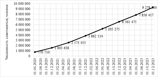 Рисунок 3. Динамика численности самозанятых в России в 2020–2023 годах, человек Источник: рассчитано и составлено автором на основе источника «Сведения о количестве самозанятых граждан, зафиксировавших свой статус, с учетом введения налогового режима для самозанятых»