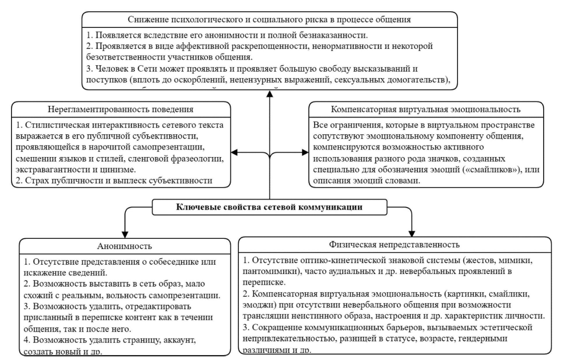 В рамках данного исследования важно систематизировать выделенные основные категории свойств сетевой коммуникации [Жичкина А.Е., 1999, 2001; Белинская Е.П., 2002; Войскунский А.Е., 2010]. Данные категории помогут сузить и углубить анализ выявленных тенденций (рисунок).