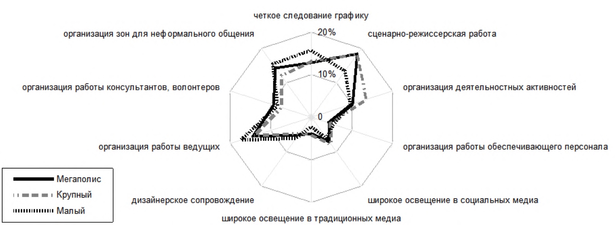 Наконец, управление инфраструктурой подразумевает целый комплекс процессов, связанных с различными элементами мероприятия. Важность тех или иных элементом отмечена выше на рис. 2., тогда как на рис. 3 показана оценка респондентами значимости того или иного вида организационно-управленческих работ, связанных с данными элементами. Здесь также можно увидеть как определенные различия (по городам), так и сходства с представленной выше оценкой значимости различных элементов. Мужчинам сравнительно более значимы этапы режиссирования, организации работы обеспечивающих специалистов; женщинам — соблюдение расписания, организация работы ведущих и волонтеров.