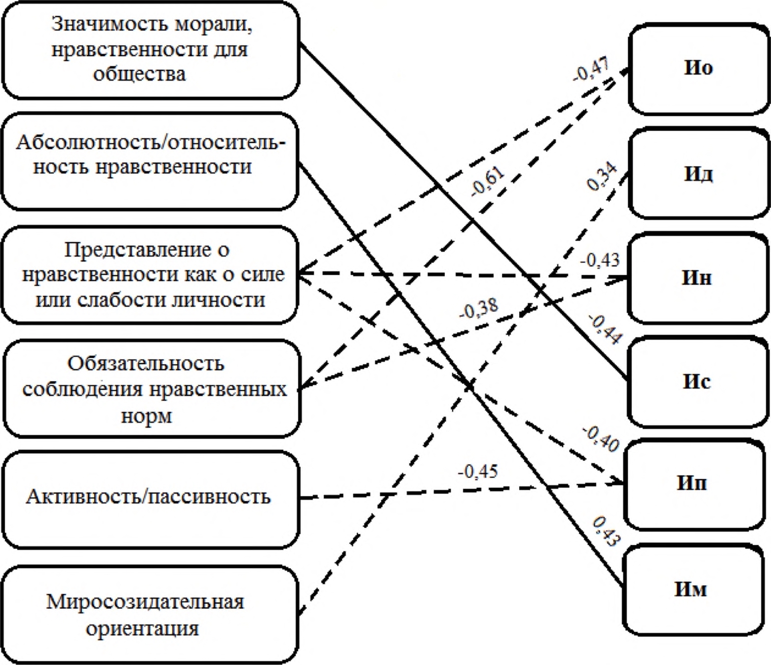 Рис. 1. Корреляционные взаимосвязи показателей по результатам методик «Представления о нравственности и морали» и «Исследование уровня субъективного контроля»