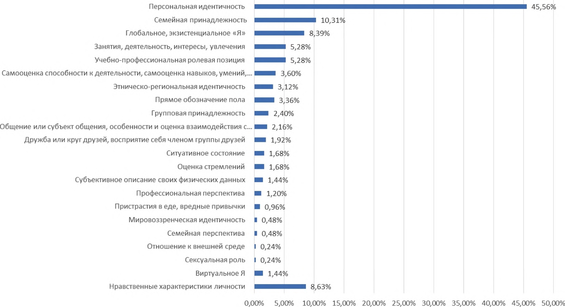 Наиболее распространенной является категория «рефлексивное Я». При описании данной категории ответы распределились следующим образом: персональная идентичность (45,56 %), экзистенциальное «Я» (8,39 %), мировоззренческая идентичность (0,48 %). Вторую позицию при описании занимает «социальное Я»: семейная принадлежность (10,31 %), учебно-профессиональная позиция (5,28 %), деятельность, интересы, увлечения (5,28 %), этническо-региональная идентичность (3,12 %). Остальные категории представлены в следующем соотношении: «деятельное Я» — 3,6 %; «физическое Я» — прямое обозначение пола (3,36 %), субъективное описание своих физических данных (1,44 %), пристрастия в еде, вредные привычки (0,96 %); «коммуникативное Я» — общение, особенности и оценка взаимодействия с людьми (2,16 %), дружба или круг друзей, восприятие себя членом группы друзей (1,92 %); «перспективное Я» — профессиональная перспектива (1,2 %), семейная перспектива (0,48 %). Категория «виртуальное Я» составляет 1,44 %. Включенные в данную категорию ответы также могут быть отнесены к показателям «групповая принадлежность», «занятия, деятельность, интересы, увлечения» и «самооценка способности к деятельности, самооценка навыков, умений, знаний, компетенции, достижений». Всего получилось 20 видов тем. Дополнительно для данного исследования нами также были выделены еще два дополнительных фактора: «Виртуальное Я» (геймер; блогер; не разбираюсь в компьютерах; пользователь; потребительница интернет-контента; интернет-пользователь) и нравственные характеристики личности.
