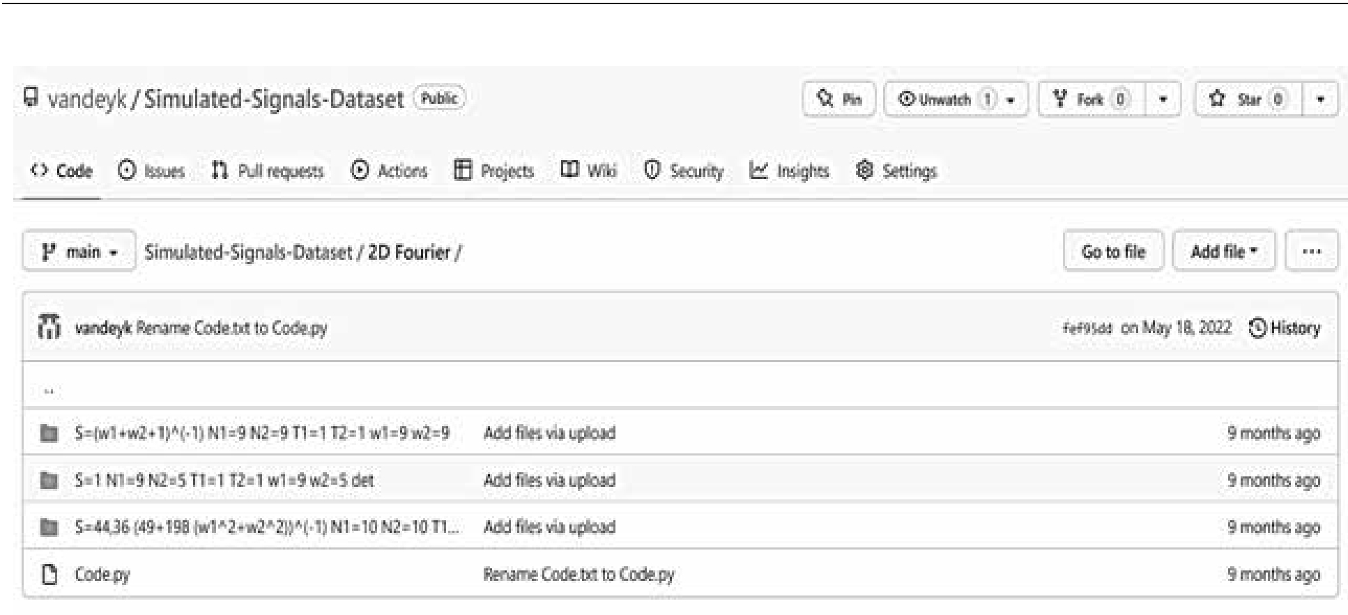 Формирование репозитория под названием Simulated-Signals-Dataset произведено на ресурсе GitHub [22]. Итоговый вид верхнего каталога репозитория показан на рис. 3.