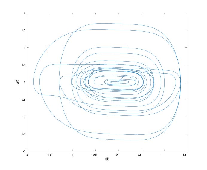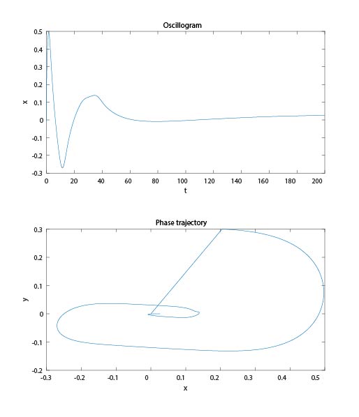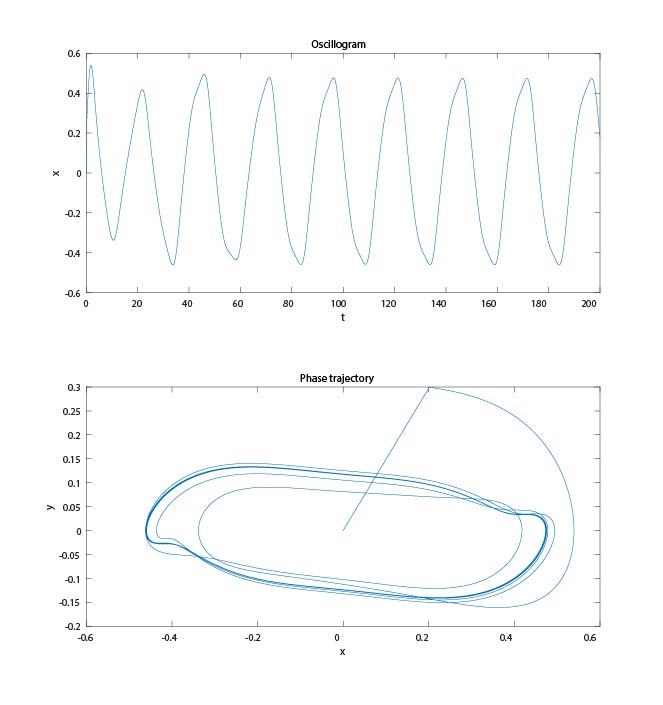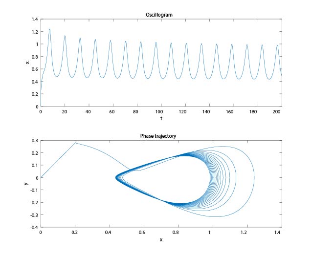 Мы видим, что со временем колебания устанавливаются, фазовая траектория выходит на замкнутую орбиту — предельный цикл. Это может означать наличие автоколебательного режима, т.е. режима колебаний, который обеспечивается не внешней периодической силой, а самой системой. Возьмем параметры , а остальные оставим без изменения.