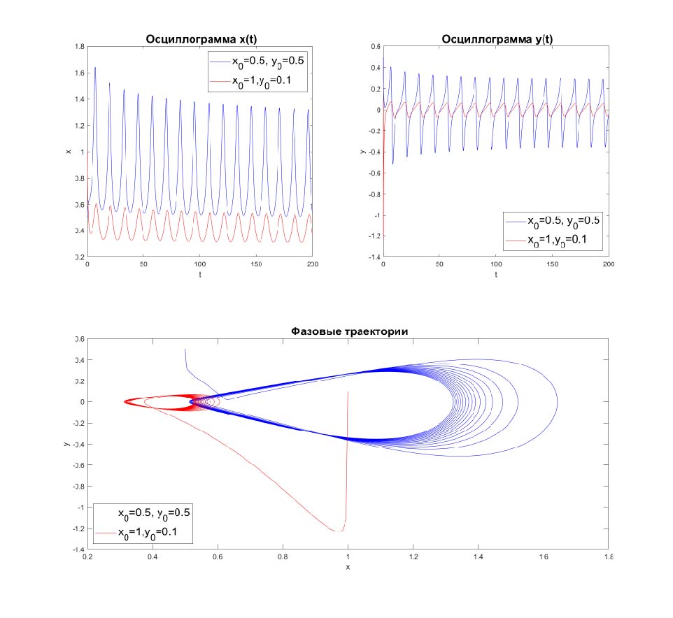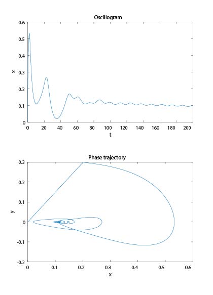 Figure 7. Oscillograms and phase trajectories at values β1 = 0.8, β2 = 1.