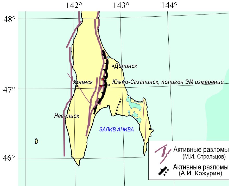 С учетом изложенного представляет интерес регистрация и анализ вариаций ЭТП вблизи очага землетрясения, которое произошло 09.08.2023 (M = 3,8) на Сахалине с эпицентром, лежащим на одной из ветвей Центрально-Сахалинского разлома [?] в непосредственной близости к пункту измерений ЭТП (рис. 1).