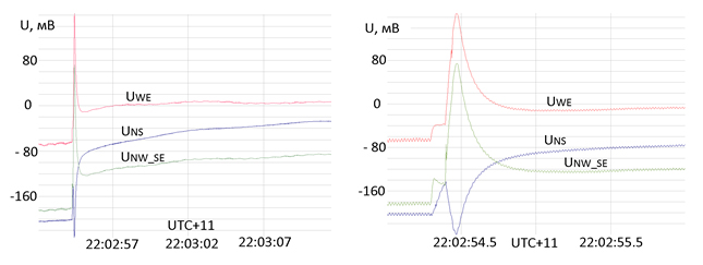 Разброс уровней измеряемого сигнала находится в пределах 0-600 мВ. Кроме того, сигнал может менять полярность. При близком ударе молнии (менее 600 м) был зафиксирован быстрый переходный процесс, похожий на отклик линейного осциллятора с затуханием на ступенчатое возмущение. На рис. 3 показаны зависимости от времени разности потенциалов на всех трех диполях при этом процессе.