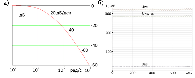 В модуле «ИМПульс» для ограничения ширины спектра входного сигнала применен RC-фильтр третьего порядка, амплитудно-частотная характеристика (АЧХ) которого приведена на рис. 4а.