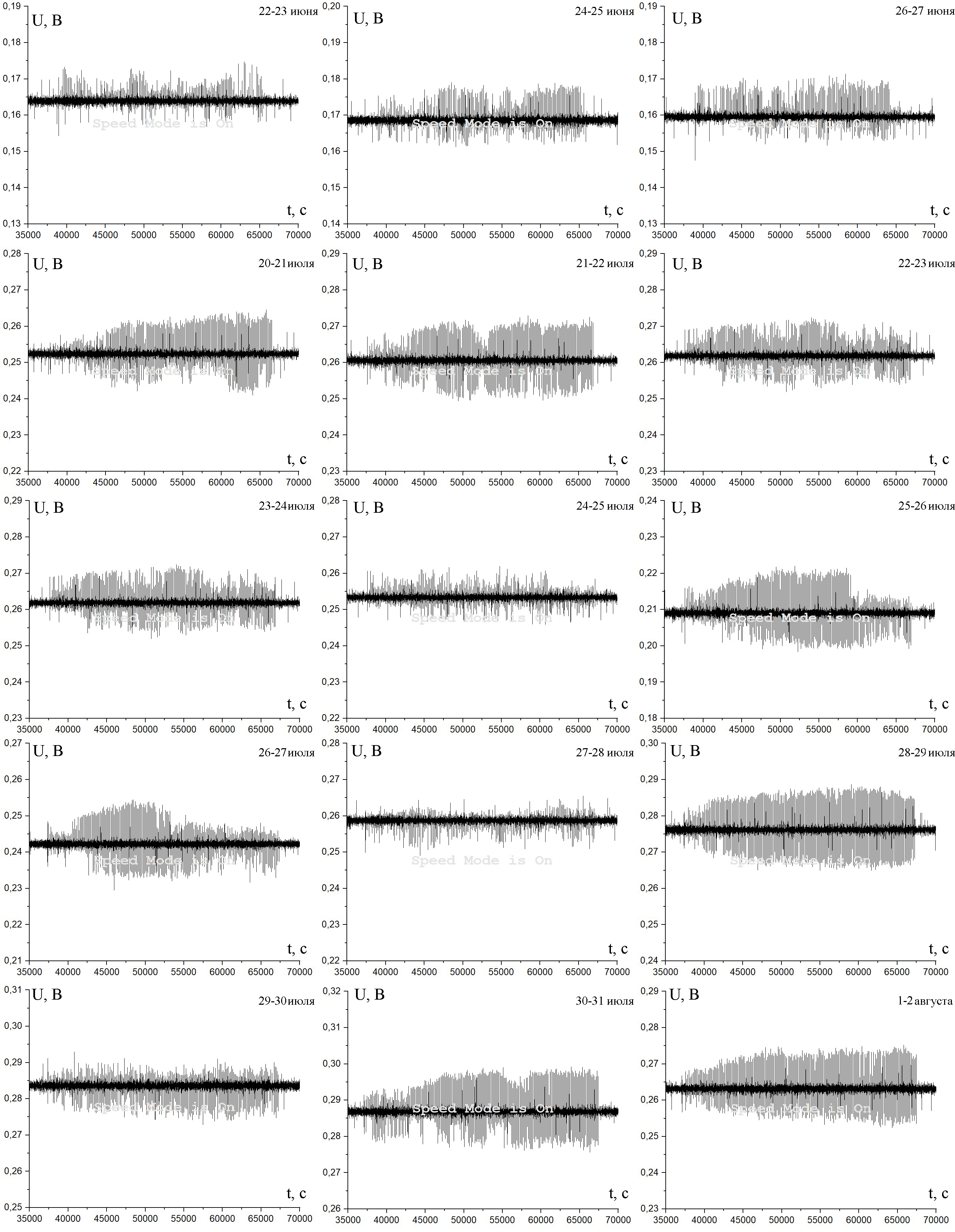 Для наглядности на рис. 8 и рис. 9 (продолжение рис. 8) мы покажем записи с канала NW-SE в “ночное“ время с 20 часов 45 минут до 6 часов 25 минут посуточно. На рис. 8 первые три записи из июня месяца, когда проводилась настройка аппаратуры, и данных для анализа практически нет. Однако на них видно, что в 20х числах июня сигнал очень слабый и нестабильный. Все графики сделаны в одном масштабе времени и напряжений для того чтобы было легче сравнивать (вся ось Y – 0,06 В).