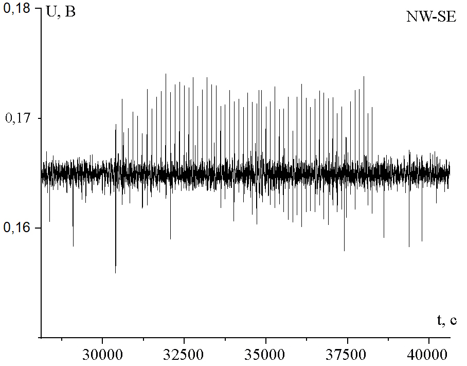 - Амплитуда сигналов в большинстве суток небольшая, на канале N-S немного выше шума (порой на уровне шума, около 1 мВ), а на каналах NW-SE и W-E хорошо различимы на уровне около 10 мВ.