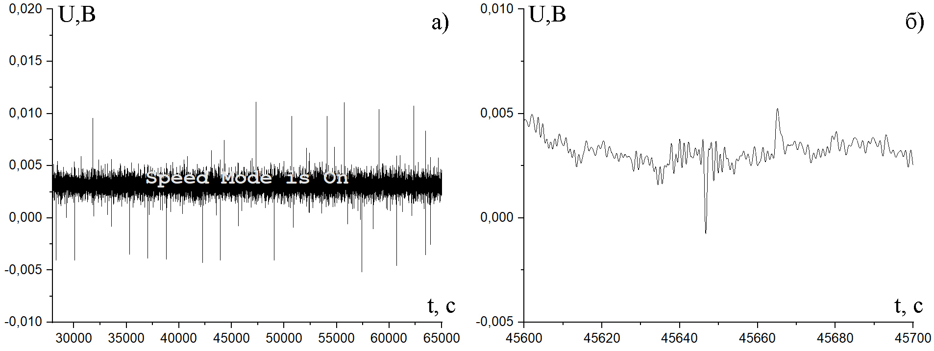 Рис. 11. а) Запись с канала NW-SE в ночь на 18-19 сентября 2023 г., б) увеличенный фрагмент записи а)