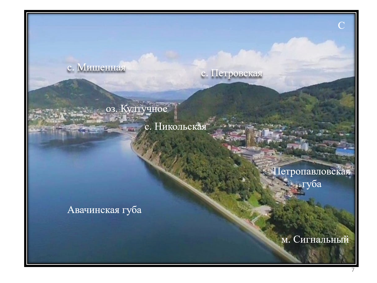 Рис. 2. Объекты исследования на территории города Петропавловск-Камчатский: сопка Никольская, Култучное озеро, сопка Мишенная (Россия, Камчатка)