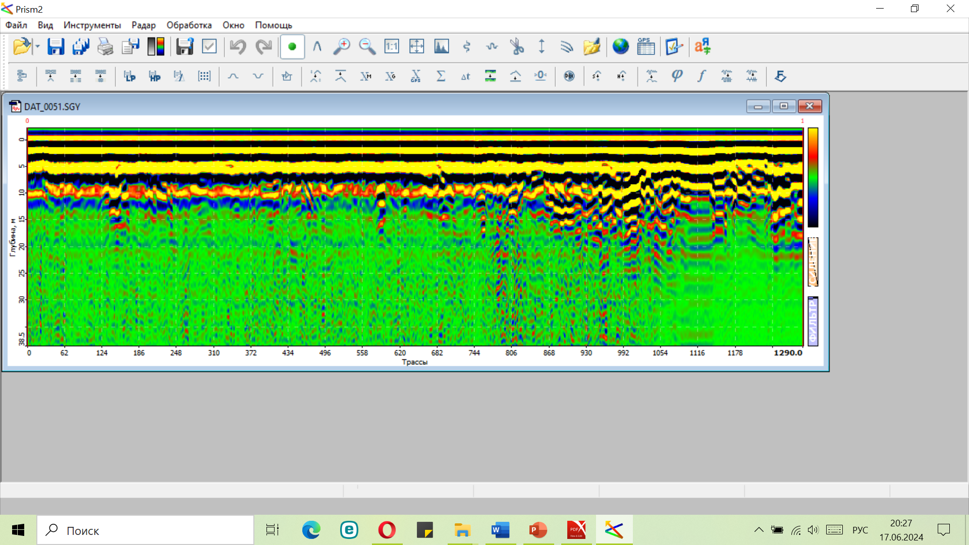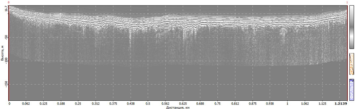Рис. 4. Пример радарограммы в программе Prism 2.5 (георадар «ПИТОН-3». Сопка Никольская, город Петропавловск- Камчатский)