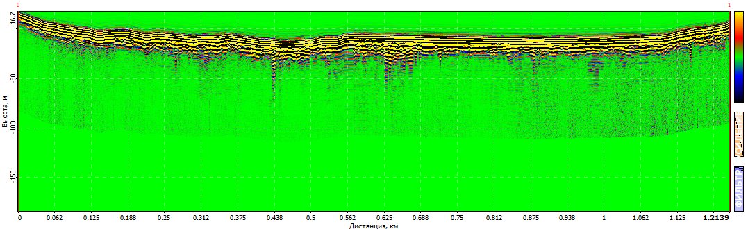Использование данной функции позволяет отобразить радарограмму с учетом рельефа местности, что помогает при обработке и интерпретации увидеть особенности расположение имеющихся геологических структур (угол наклона слоев, мощность и др.) (рис. 7).