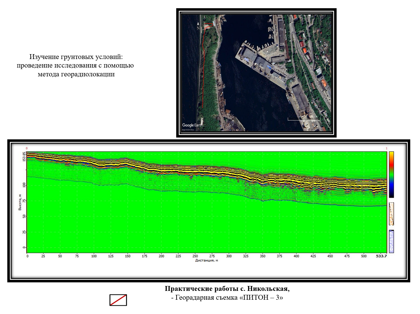 Прибор георадар «ПИТОН» информативен для исследования на большие глубины при решении геологических задач на территории города Петропавловск-Камчатский. Стоит учесть, что теряется информативность верхней части зондируемой среды (более мелкие геологические структуры можно не обнаружить). Для точной интерпретации получаемых радарограмм необходимо использовать сведения о геологическом строении исследуемой территории.
