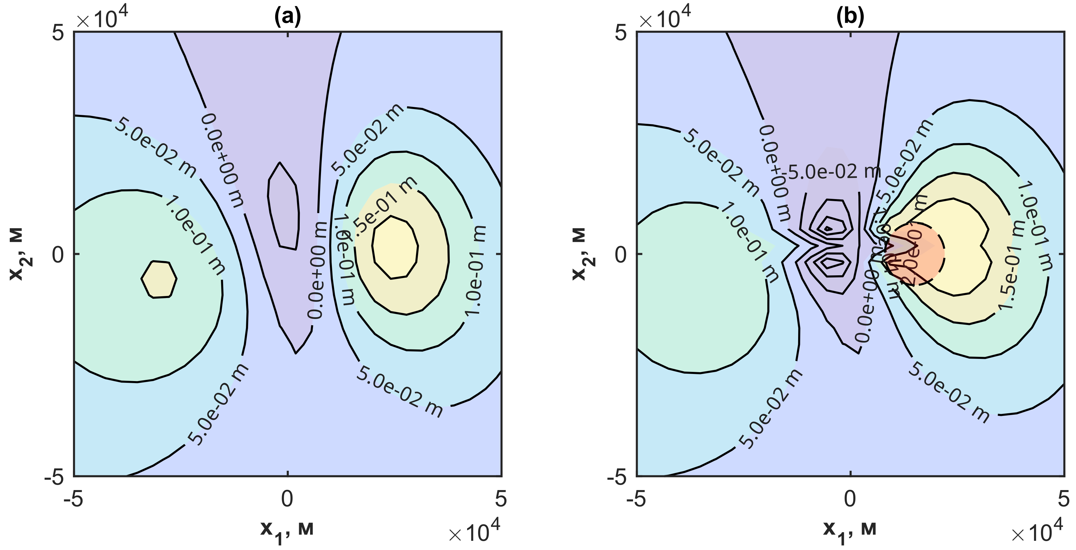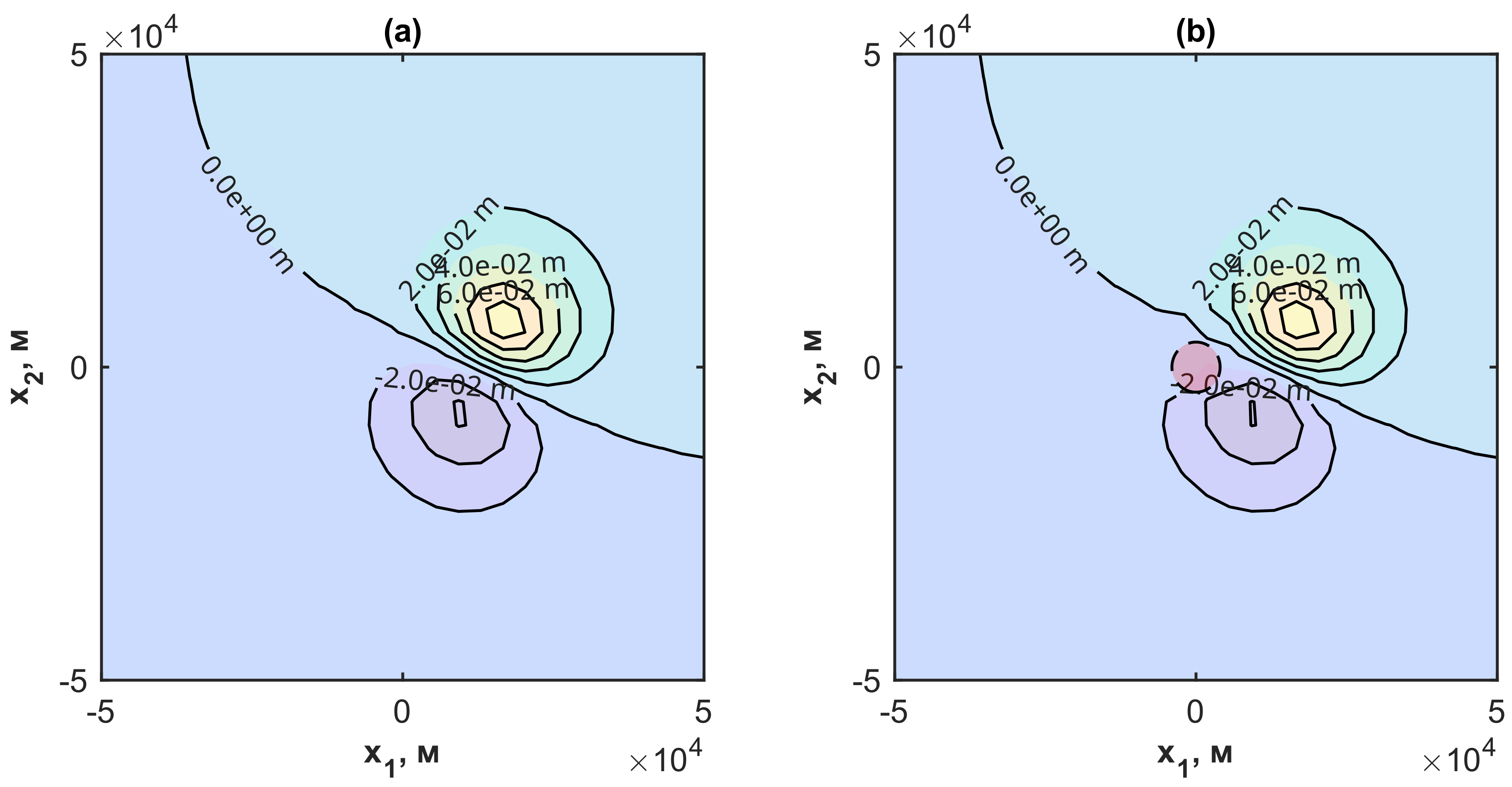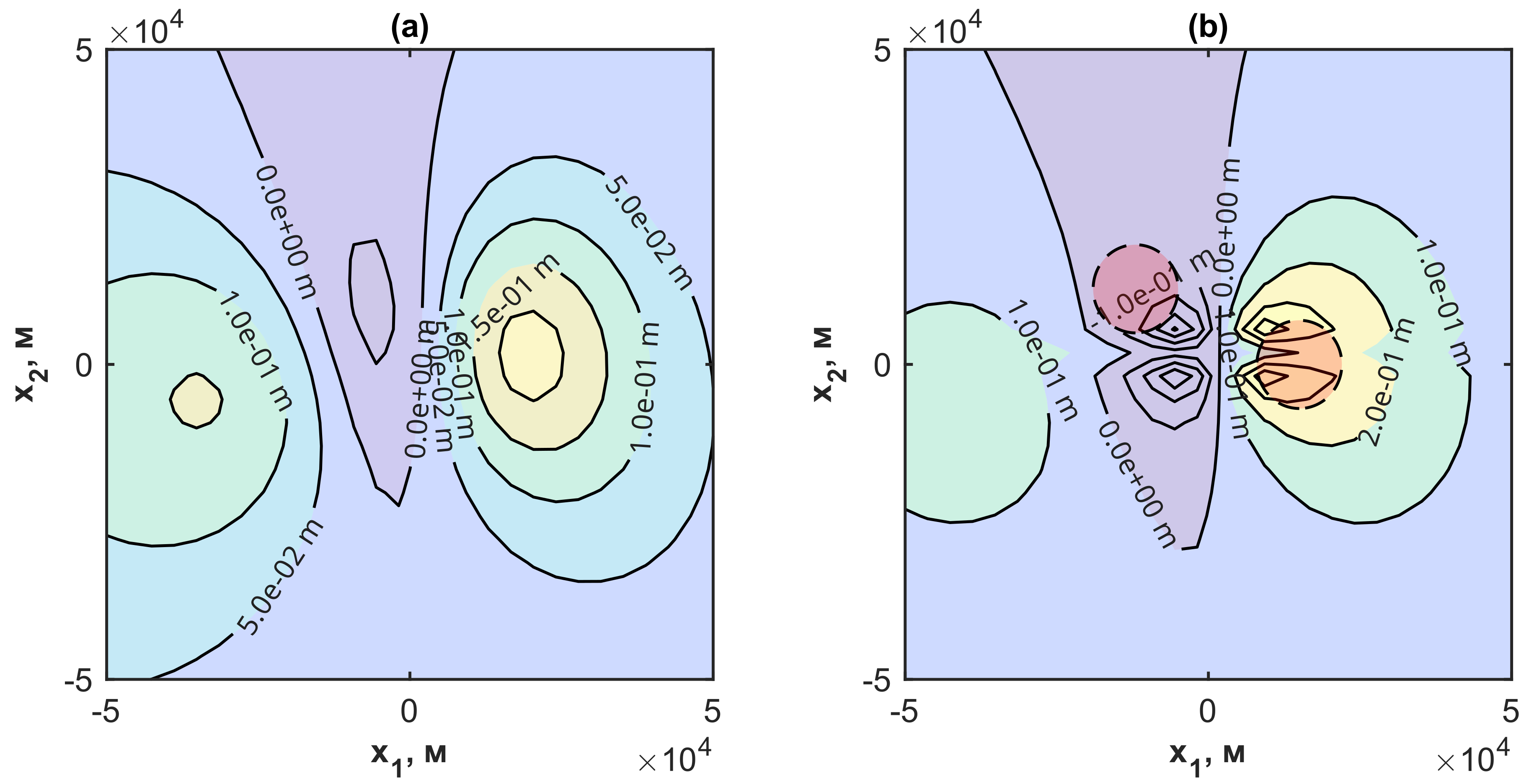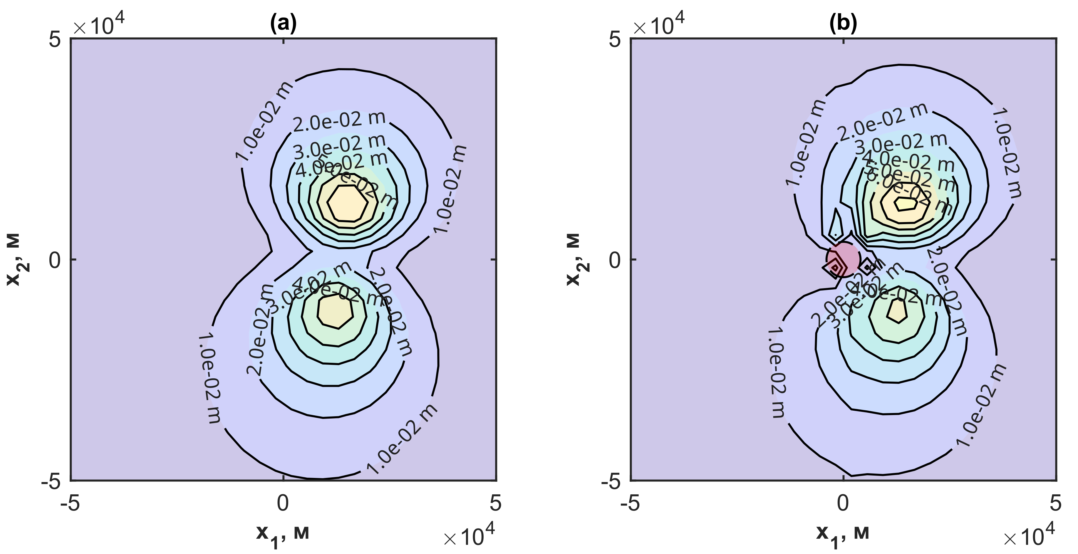 Вычислительный эксперимент №3. Все параметры эксперимента идентичны предыдущему. Добавлено второе неоднородное включение с центром в точке м, м, м и величиной силы Н. Результаты моделирования в виде компонентов вектора смещений на поверхности представлены на рис. 8 10.