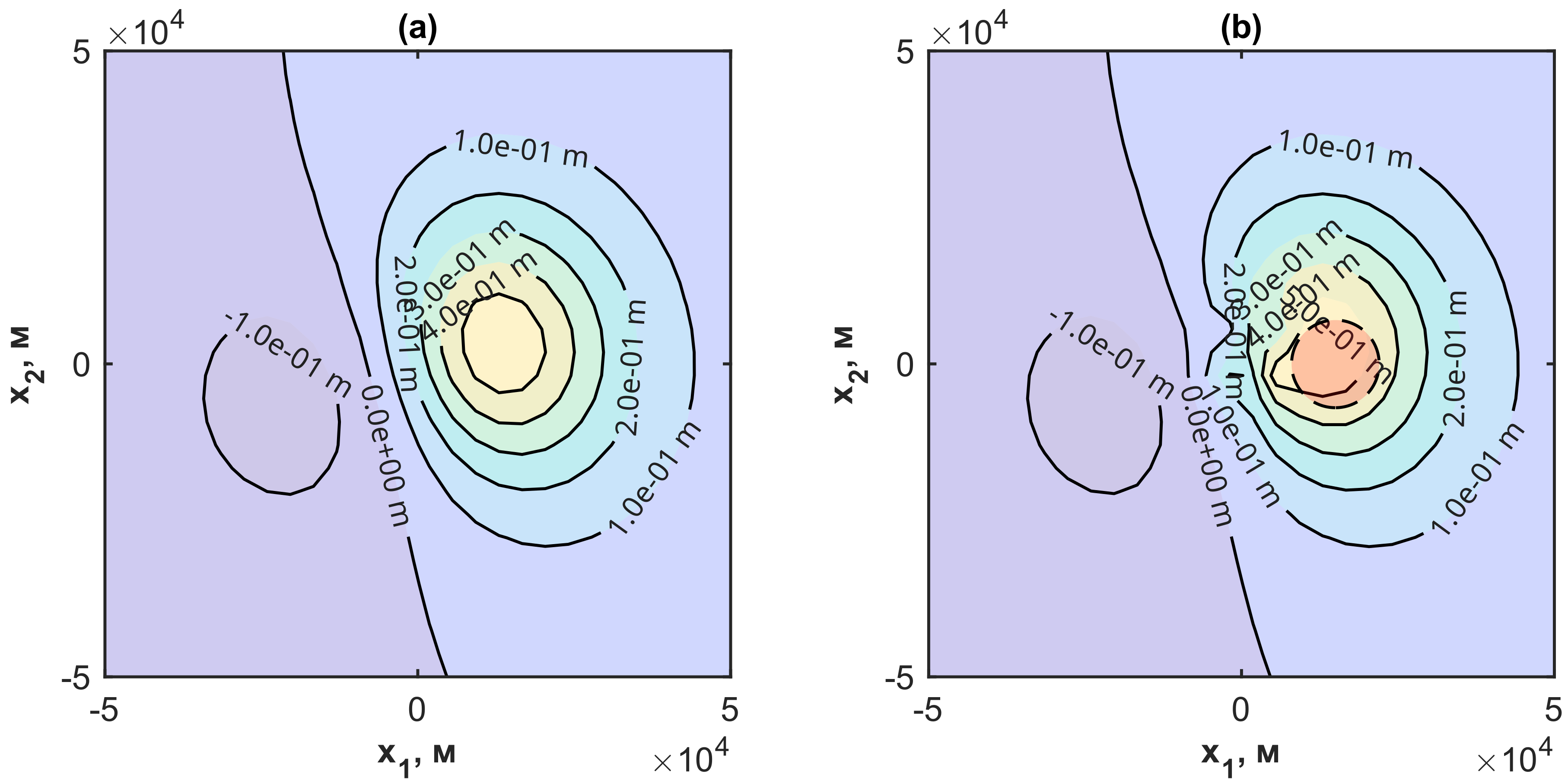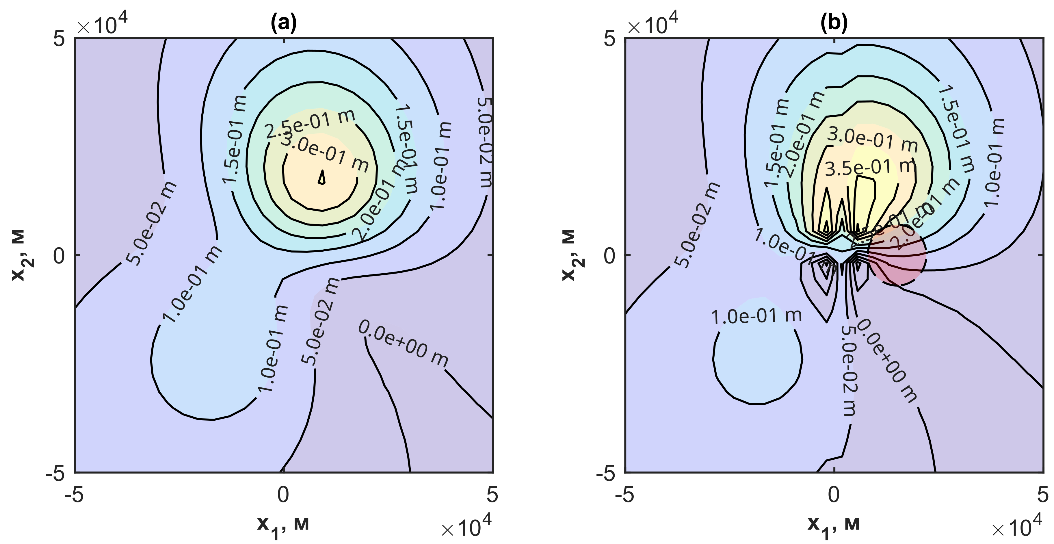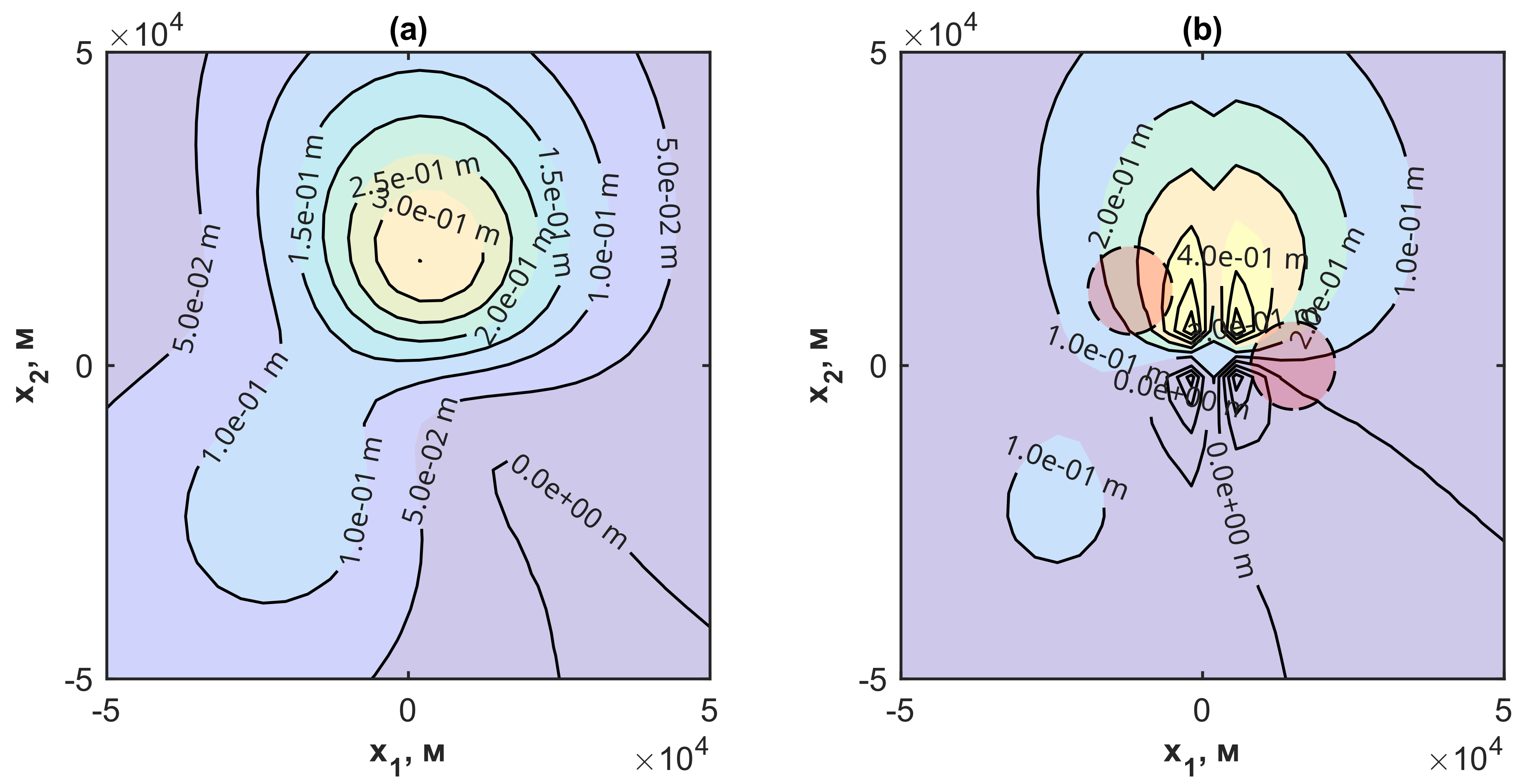 [Figure 8. Result of the computational experiment №3. Component u1 of the shift vector on the surface x3 = 0 in case of homogeneous environment (a) and with a spherical inhomogeneity (b); 🟠 projection of the spherical inhomogeneity on the surface x3 = 0.]