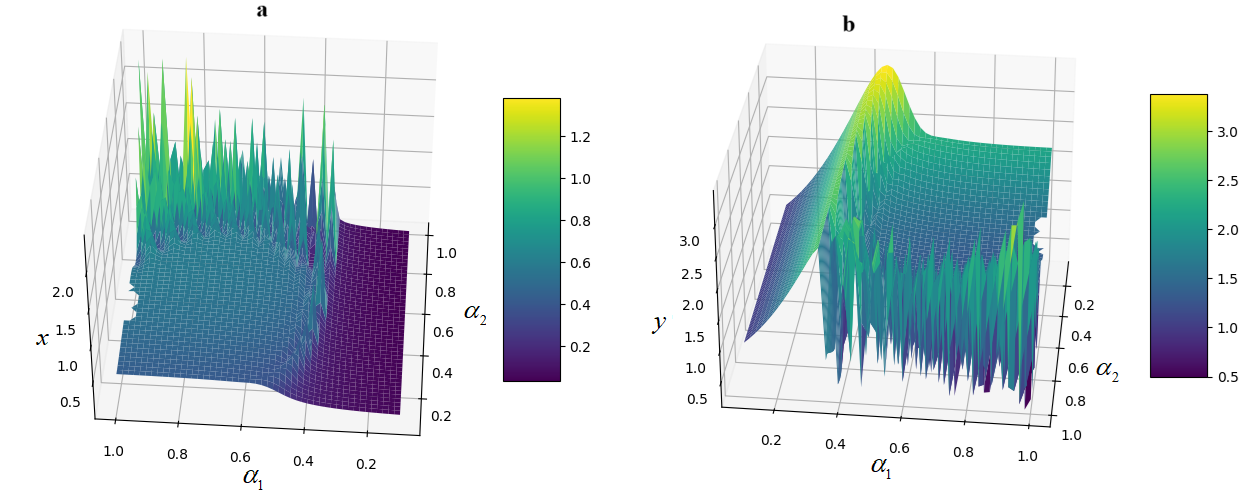 Figure 4. 3D surfaces a) x(α1,α2); b) y(α1,α2).