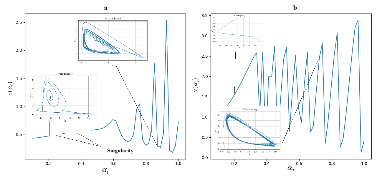 На рис. 1. приведены бифуркационные диаграммы в виде поверхностей искомого решения и от значений порядков дробных производных и . Отметим, что на поверхностях рис.1a и рис. 1b есть области которые отвечают за регулярные режимы, например, затухающие колебания соответствуют областям без всплесков, в области всплесков могут формироваться предельные циклы, а также предхаотические или хаотические режимы. Кроме того, мы видим область рваные области, что, как мы покажем дальше, связано с сингулярностью.