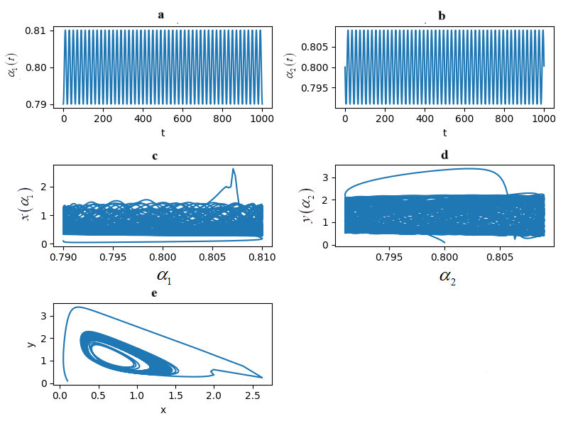 Пример 2. Значения параметров выберем следующми: , остальные параметры возьмем из Примера 1. Порядки дробных производных изменяются во времени по следующим законам: