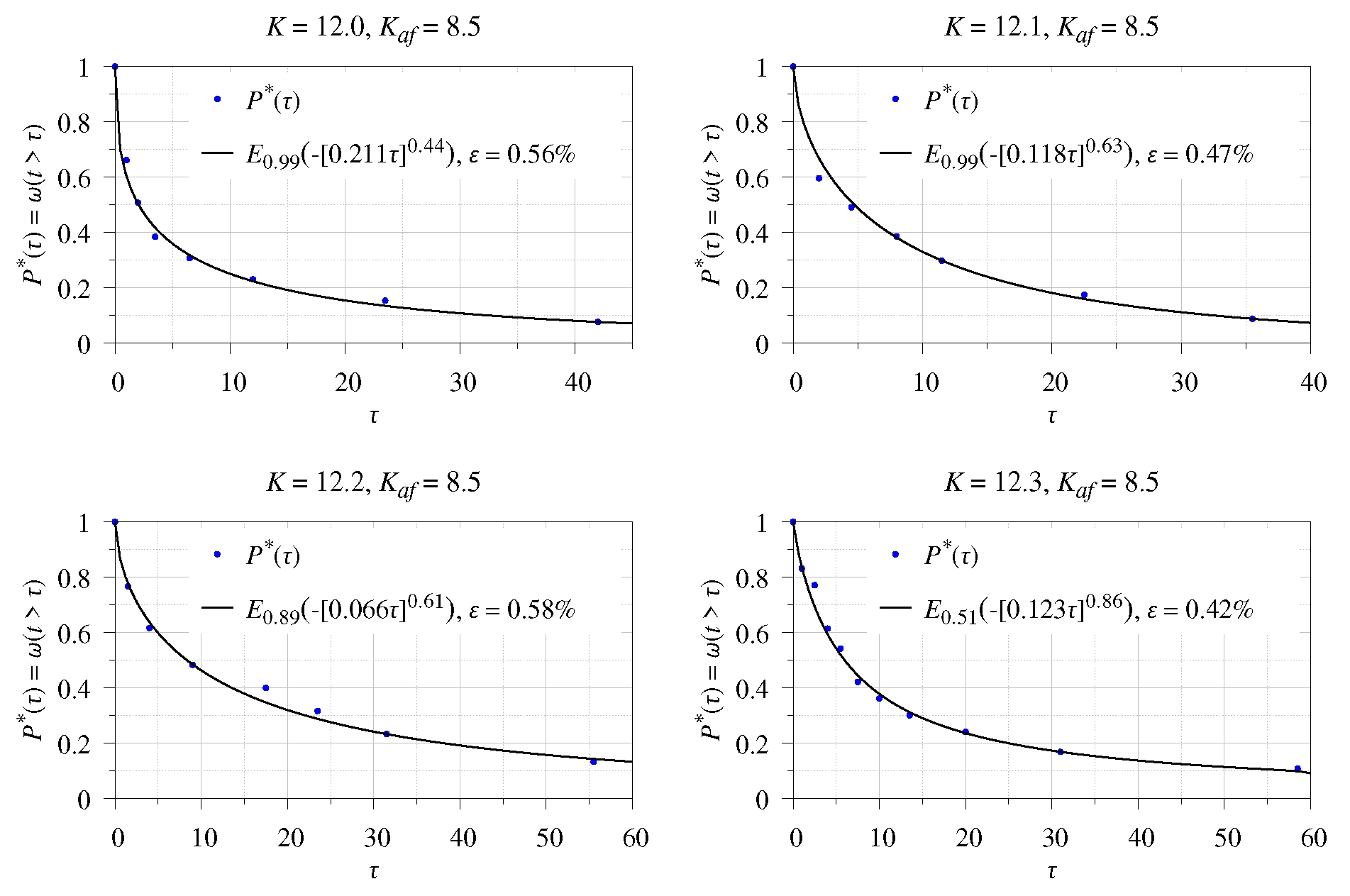 Логическим продолжением исследований рассматриваемой дробной модели деформационного процесса является её верификация в фазе релаксации на основании данных каталога землетрясений КФ ФИЦ ЕГС РАН для зоны субдукции Курило-Камчатской островной дуги ( N, E) [16]. Согласно модели трёхпараметрического дробного пуассоновского процесса [7], которая позволяет представить как нормальные, так и аномальные процессы активизации и релаксации, законы распределения времени ожидания афтершоков (фаза релаксации) аппроксимируются убывающей дробной функцией МиттагЛеффлёра с параметрами , и :