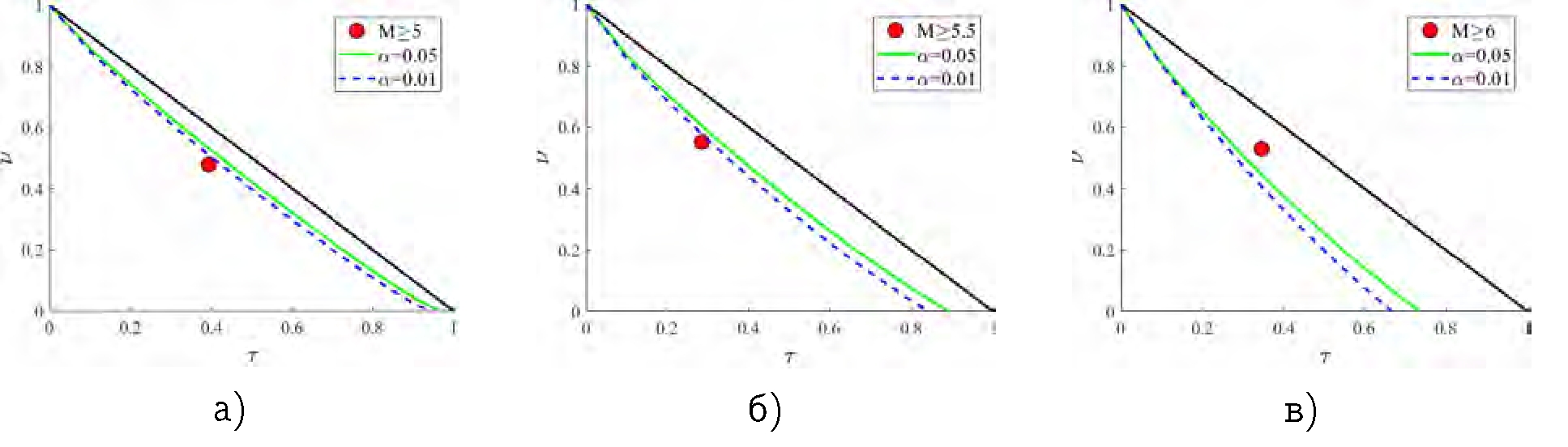 В таблице 3 и на рисунке 3 представлены результаты оценки прогностической эффективности по методике Г.А. Молчана. На диаграммах ошибок (рисунки 3а,б) точки прогноза ( , ) для землетрясений с магнитудами и лежат ниже 99% доверительного интервала, что может быть интерпретировано как наличие достаточно надежной связи между идентифицированным комплексом ионосферных аномалий и землетрясениями соответствующих диапазонов магнитуд. Наибольшее значение параметр принимает для диапазона магнитуд и равен 0.16.