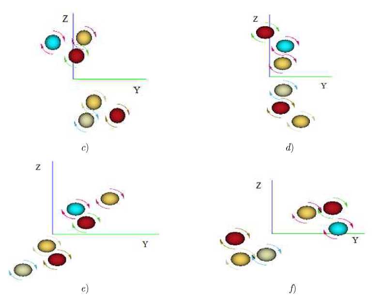 Рис. 5.1. Последовательное формирование структуры в результате коллективной динамики цепочки из 6 вращающихся частиц: a) начальная конфигурация цепочки ( с); b) разделение цепочки на две группы вращающихся частиц ( с); c), d), e), f) динамика образованной структуры из двух групп вращающихся частиц ( с) Fig 5.1. Sequential formation of a structure as a result of the collective dynamics of a chain of 6 rotating particles: a) initial configuration of the chain ( s); b) division of the chain into two groups of rotating particles ( s); it c), d), e), f) dynamics of the formed structure of two groups of rotating particles ( s)