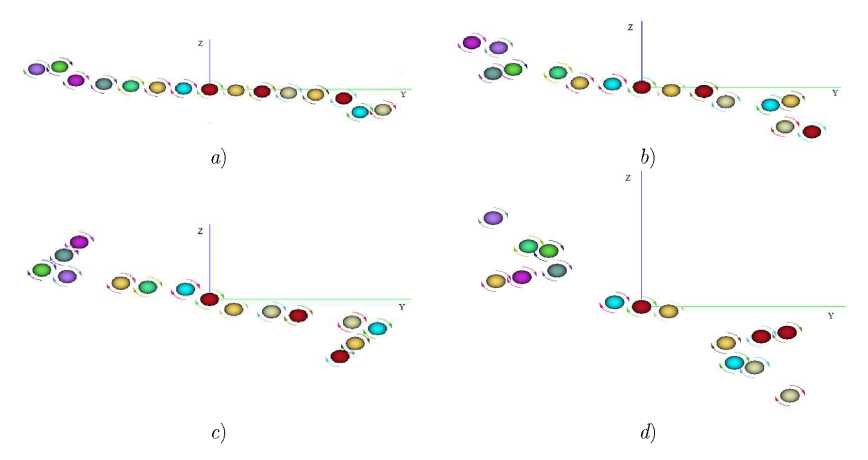 Рис. 5.2. Последовательное формирование структуры в результате коллективной динамики цепочки из 8 вращающихся частиц: a) фаза деформации цепочки ( с); b) разделение цепочки на две группы вращающихся частиц ( с); c), d) динамика образованной структуры из двух групп вращающихся частиц ( с) Fig 5.2. Sequential formation of a structure as a result of the collective dynamics of a chain of 8 rotating particles: a) chain deformation phase ( s); b) division of the chain into two groups of rotating particles ( s); c), d) dynamics of the formed structure of two groups of rotating particles ( s).