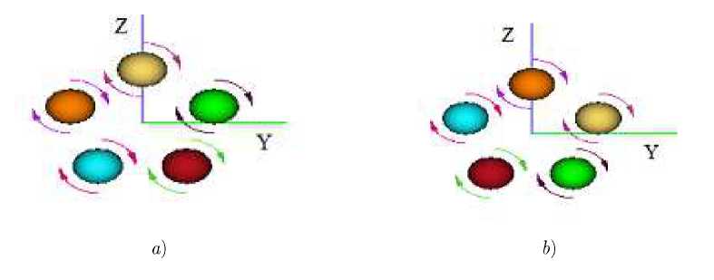 Рис. 5.4. Коллективная динамики кольца из пяти вращающихся частиц: a) начальная структура ( с); b) сохранение структуры в результате динамики вращающихся частиц ( с) Fig 5.4. Collective dynamics of a ring of five rotating particles: a) initial structure ( s); b) preservation of structure as a result of the dynamics of rotating particles ( s)