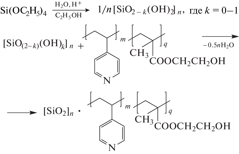 Hybrid organic-inorganic membranes based on tetraethoxysilane and orthophosphoric acid-doped copolymers of 4-vinylpyridine (4-VP) and 2-hydroxyethyl methacrylate (HEMA) were formed by the sol-gel synthesis method. The membranes are characterized by high values of exchange capacity and proton conductivity. An increase in the proton conductivity of hybrid organo-inorganic membranes compared to the initial copolymer can be associated with the generation of water of crystallization during the formation of a silicon dioxide fragment, which follows from quantum-chemical modeling of the local structure of the membrane, which includes an organic part from the copolymerization product of 4-VP with HEMA (44 atoms) and an inorganic part of 27 atoms, repeating the structure of the silicon dioxide block.