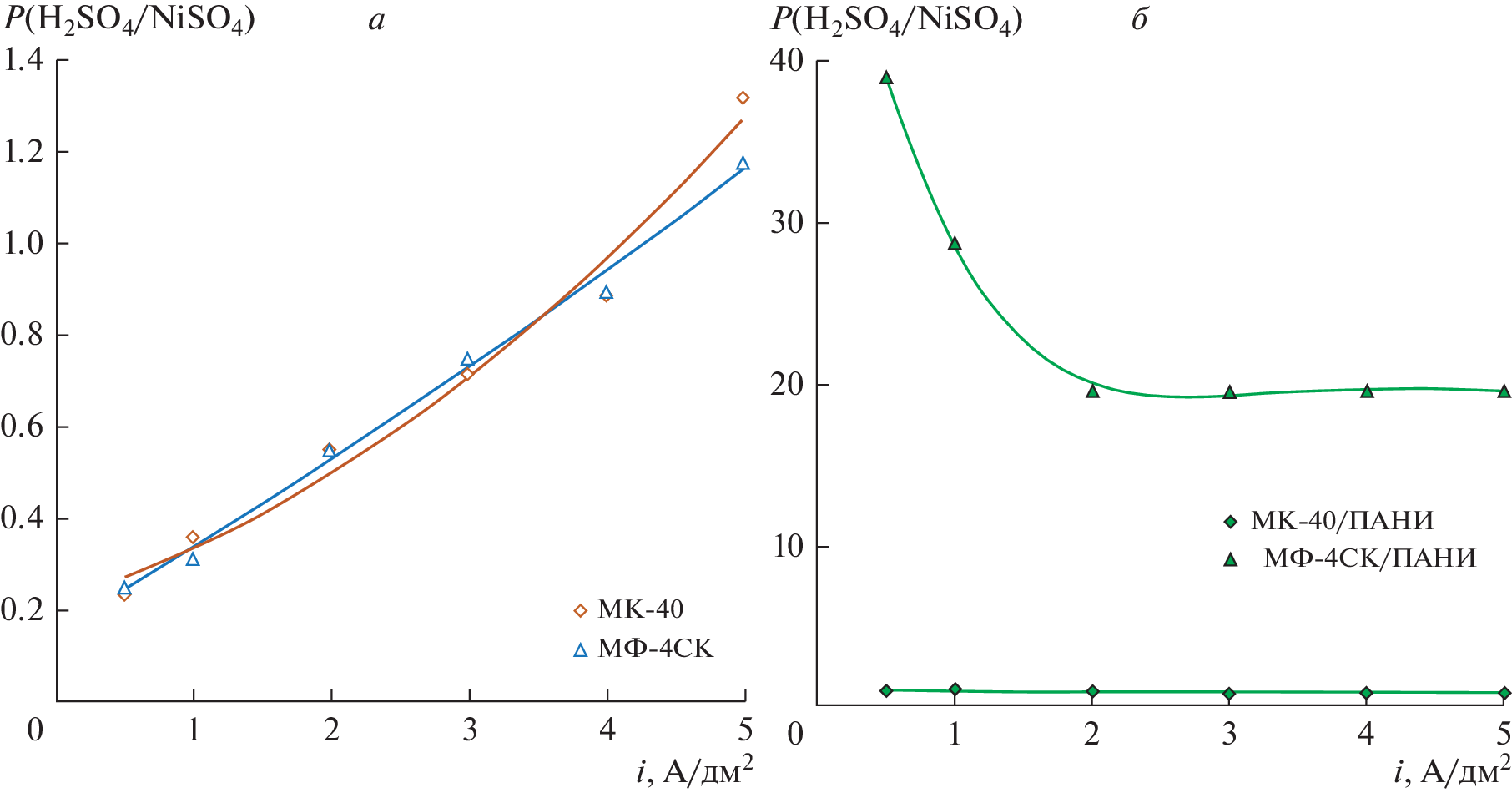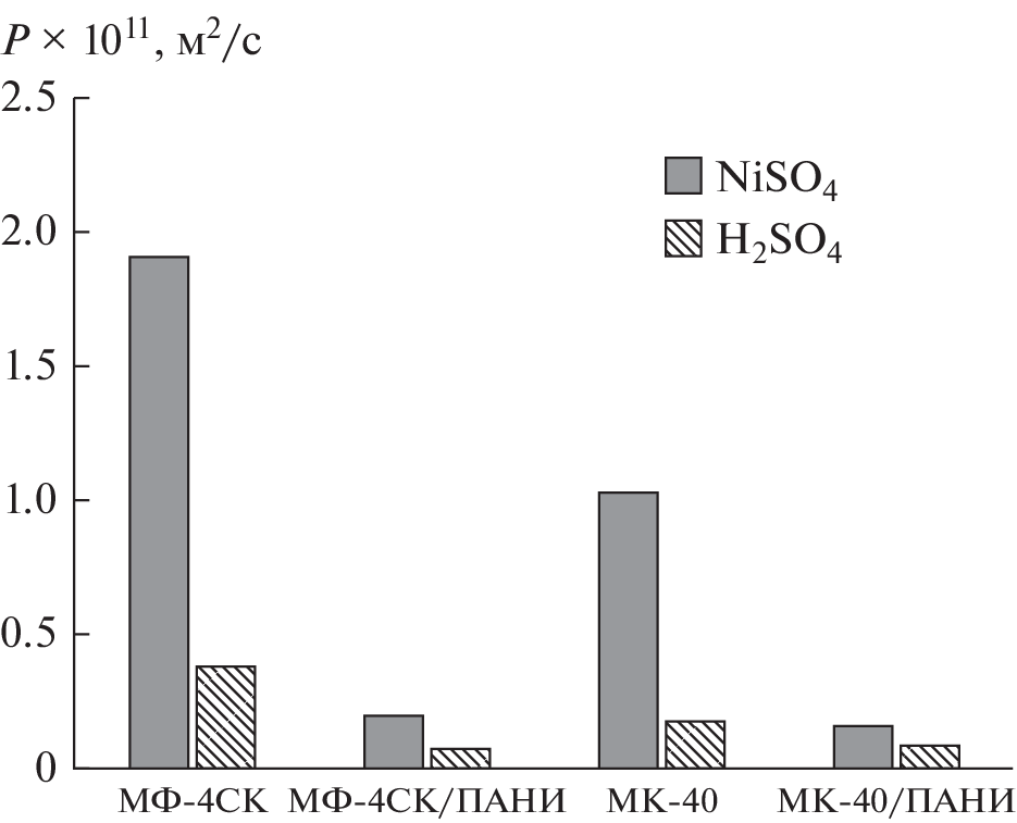 The paper discusses the electrodialysis treatment of mixed nickel sulfate and sulfuric acid solution using polyaniline surface-modified cation exchange membranes. The modified membranes are obtained on the basis of industrial cation-exchange MK-40 heterogeneous and MF-4SK homogeneous membranes by in situ oxidative polymerization of aniline under electrodialysis conditions. The conductive and diffusion characteristics of the initial and modified membranes in solutions of sulfuric acid and nickel sulfate are studied. It is shown that the modification of membranes with polyaniline leads to a decrease in their electrical conductivity and diffusion permeability while maintaining high selectivity. The diffusion permeability of cation-exchange membranes is higher in nickel sulfate solutions compared to sulfuric acid one, while an inverse dependence is found for anion-exchange membranes. The competitive transfer of sulfuric acid and nickel sulfate during electrodialysis separation and concentration of their mixture using initial and modified cation-exchange membranes paired with anion-exchange MA-41 membrane are studied. It is shown that the applying a polyaniline layer with positively charged groups on the surface of the MK-40 or MF-4SK cation-exchange membranes suppresses the transport of doubly charged nickel ions both in the separation and concentration modes over the entire range of current densities. The greatest repulsion effect is observed for homogeneous modified membranes, where the selective permeability coefficient P(H2SO4/NiSO4) increases from 0.7–1.7 to 32.5–19.7 depending on the current density. It is established that the use of polyaniline modified cation-exchange membranes permits to concentrate the solution containing 0.1 mol-eq/L (4.9 g/L) H2SO4 and 0.1 mol-eq/L (7.7 g/L) NiSO4, with simultaneous separation into sulfuric acid with concentration about 2.4 mol-eq/L (120 g/L) and nickel sulfate solutions. The content of nickel sulfate in the concentrate does not exceed 0.13 mol-eq/L (10 g/L).