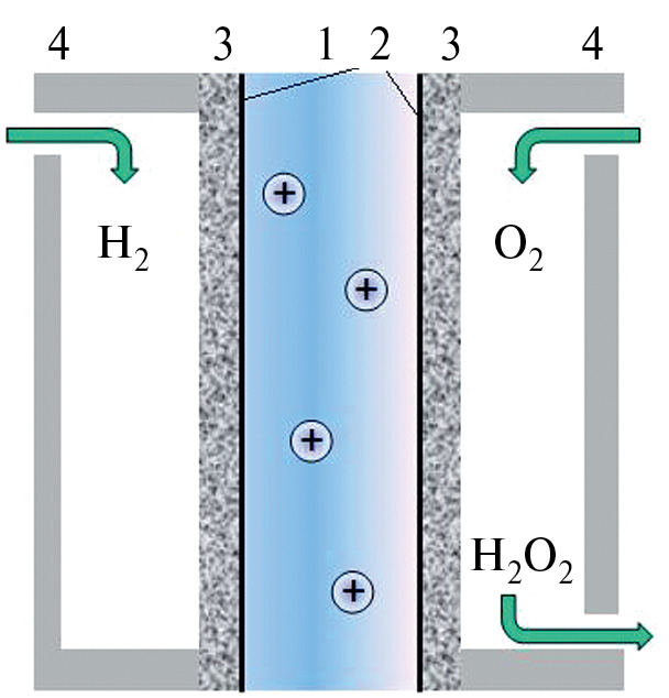 Рис. 1. Схема водород-кислородного ТЭ на основе протонпроводящих мембран. Протонпроводящая мембрана (1), катализатор (2), газодиффузионный слой (3), биполярные пластины (4).