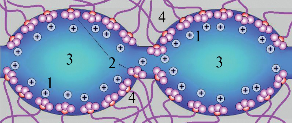 Рис. 2. Схема строения пор и каналов в ионообменных мембранах. Подвижные катионы (противоионы) (1), фиксированные ионы (2), электронейтральный раствор (3), полимерная матрица (4).