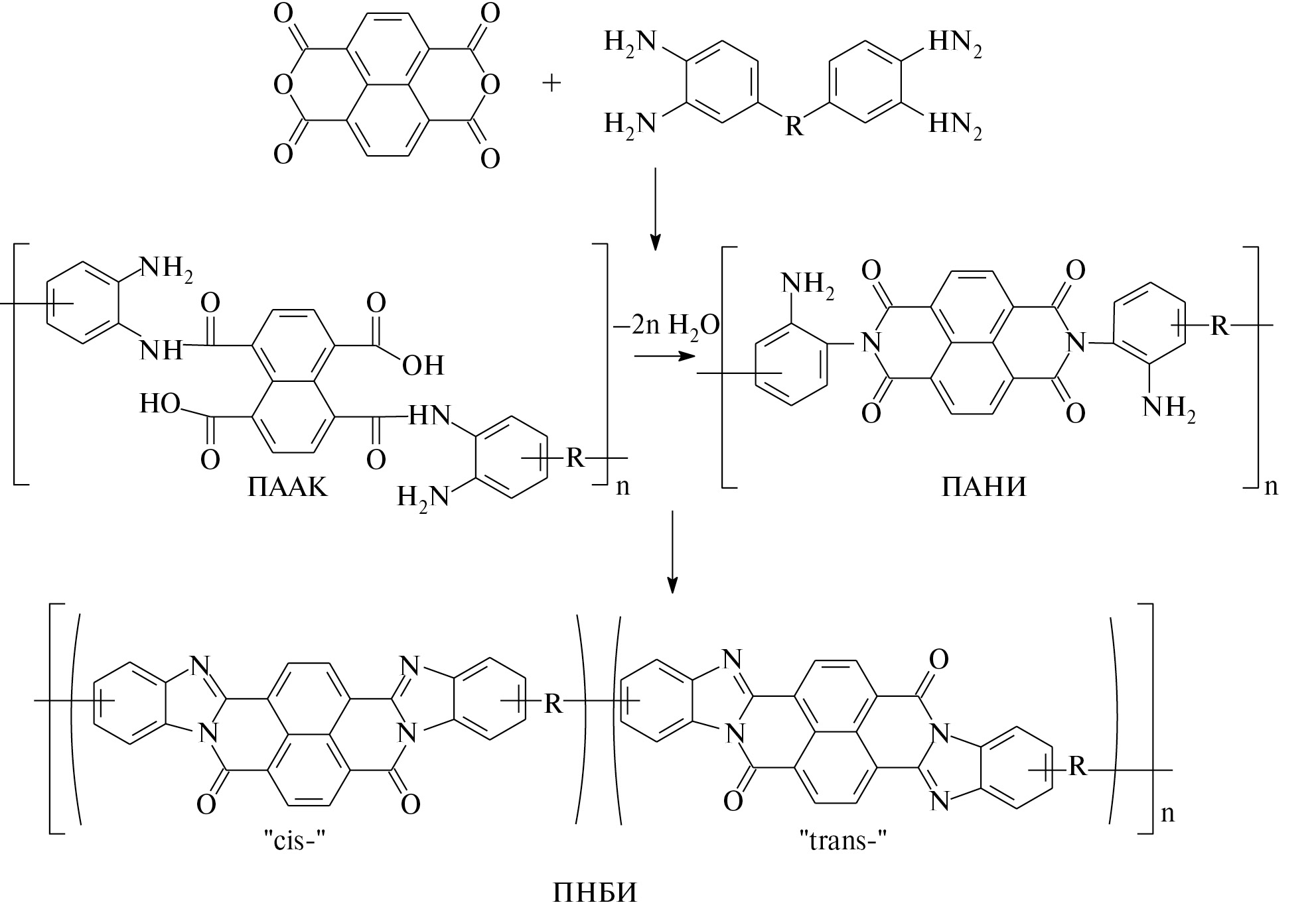 Классический синтез ПНБИ, как правило, осуществляется в среде полифосфорной кислоты, из которой весьма проблематично получать пленки и волокна. Например, наиболее известные ПНБИ волокна ВВВ (США), где R = – (σ-cвязь), в англоязычной литературе “BBB” – поли-бифенилен-бис-бензимидазофенантролин, и ЛОЛА (СССР), где R = –O– (в русскоязычной литературе “ПНБИ-О”) получали в опытно-промышленном масштабе из растворов в серной кислоте, что в сегодняшних условиях невозможно по экономическим и экологическим причинам. Для получения ПНБИ более целесообразным представляется разработанный в РФ в начале XXI века 3-стадийный каталитический метод синтеза через стадию форполимеров – полиаминоамидокислоту (ПААК) и полиаминоимид (ПАНИ), образующихся последовательно в реакционном растворе в амидных апротонных растворителях, например, в N-метилпирролидоне (N-МП) в присутствии бензимидазола и бензойной кислоты в качестве катализаторов, с последующим отливом пленки и ее термической циклизации в ПНБИ по схеме, представленной на рис. 2.